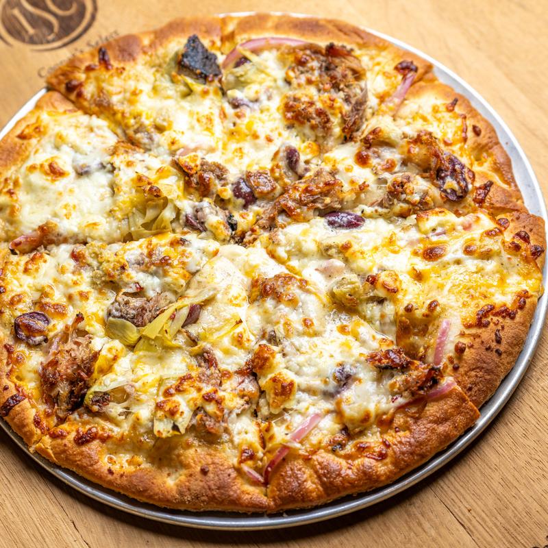 Pulled smoked pasture-raised pork, marinated artichoke, pickled onion, kalamata olive, feta cheese | White BBQ sauce